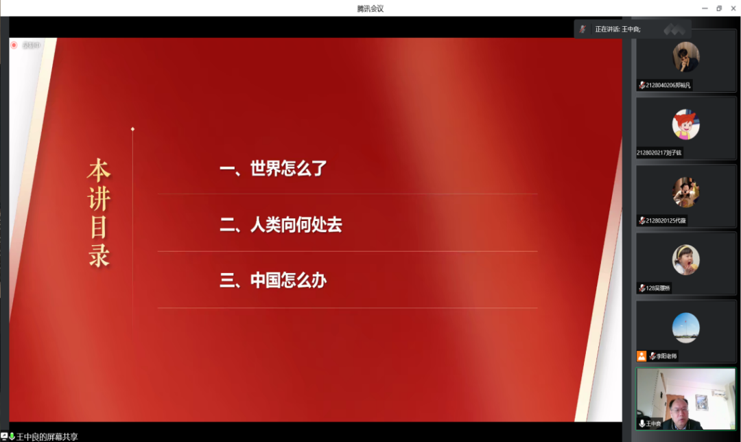 “当前,世界之变、时代之变、历史之变正以前所未有的方式展开,人类社会面临前所未有的挑战”,王中良通过解读党的二十大报告第十四部分关于推动构建人类命运共同体的论述导入课程,从带领员工思考思政和人生的关系出发,为员工讲授“推动构建人类命运共同体”这一讲。授课过程中,王中良围绕“世界怎么了”“人类向何处去”“中国怎么办”三部分内容,结合党的二十大报告的意义、主题,围绕“九个深刻领会”,带领同学们领悟“两个确立”的决定性意义、理解归根到底是“两个行”的逻辑意蕴,把握中国式现代化的中国特色和本质要求等,通过深入的理论逻辑、历史逻辑和现实逻辑为同学们讲道理、讲故事、讲现实,引导大家正确认识当今世界百年未有之大变局,深刻认识推动构建人类命运共同体的重大意义,深入理解中国方案和中国智慧。王中良希望同学们学深悟透其中蕴含的胸怀天下的世界观和方法论,在投身全面建设社会主义现代化国家的火热实践中自信自强学好专业、练好本领、用活理论。