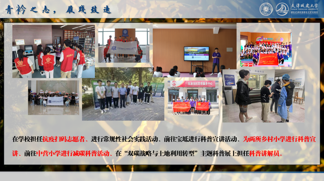 在2022年疫情期间,我以个人的滴水之力投入到抗疫的大潮之中,在校内担任扫码志愿者,在家乡也响应号召,积极投身抗疫工作之中,为图书馆、社区等多地奉献自己的一份力量。2023上半年,我积极投身与实践活动之中,在暑期国工三下乡活动中前往宝坻进行科普宣讲活动,为两所乡村小学进行科普宣讲,引发社会关注。在科普基地,我们前往中营小学进行减碳科普活动,受到广老员工以及家长们的热烈好评。在“双碳战略与土地利用转型”主题科普展上,我担任科普讲解员,向前来看展的观众们科普建筑减碳知识。