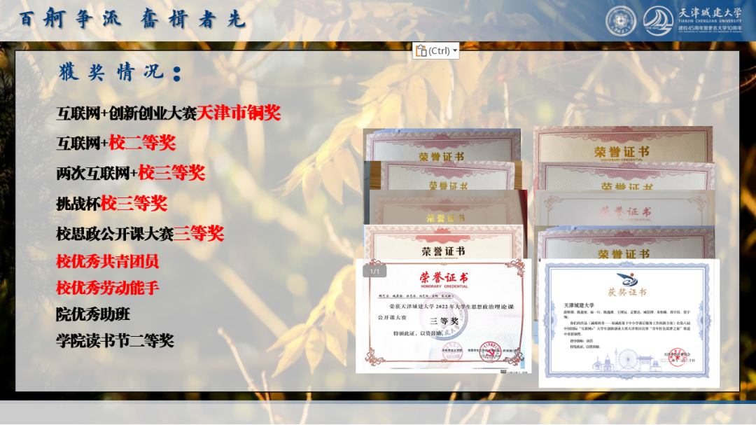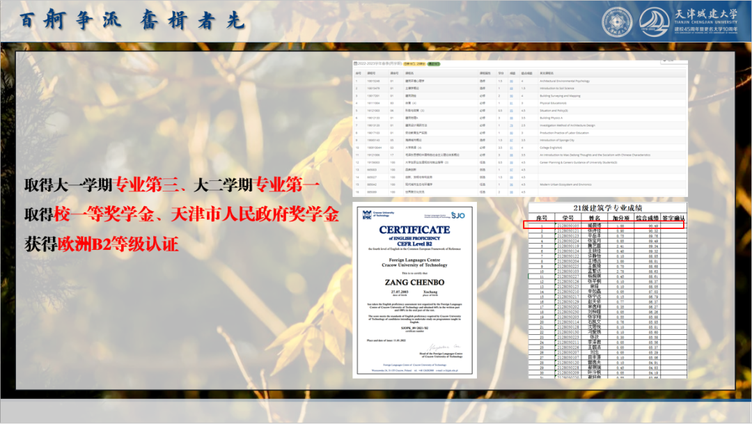 路漫漫其修远兮,吾将上下而求索。自入学城大以来,我不断在专业领域积极探索,刻苦学习、勤学好问。取得大一学年专业排名第三、大二学年专业排名第一的好成绩,荣获校一等奖学金、天津市人民政府奖学金。