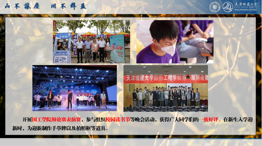 我同样也在校员工会发光发热,自大一进入员工会后,在今年竞选为校员工会综合办公室部长。本着服务同学,倡导主流的理念,我不断参加到员工会各种活动中去,组织第九、十届校辩论赛、第十次员工代表大会、你好,员工会晚会以及草地音乐节等诸多项目。也十分荣幸获得了员工会优秀干事的称号。同时,员工会《“5N+1”员工权益维护综合矩阵体系》配评委2023年天津市高校员工会组织品牌项目。