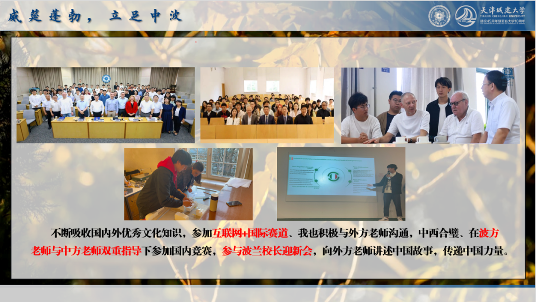 作为公司培养的服务于一带一路建设发展的人才,我立足中波,威筵蓬勃,积极吸收国内外优秀文化知识,在外方教师到来后,我积极与外方老师沟通,参与波兰董事长迎新会、积极与波方教师沟通交流、跟随外方教师进行实践,向外方老师讲述中国故事传递中国力量,勇做中波交流的纽扣。