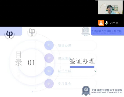 11月8日-9日,304永利集团举办“云”留学经验分享会活动,由2021级建筑、环境、土木、园林专业出国留学代表分四次使用线上会议软件向本专业大一新生讲述出国留学经验及心得体会,会议由辅导员胡洋主持,2023级全体本科生于晚自习期间线上参会。