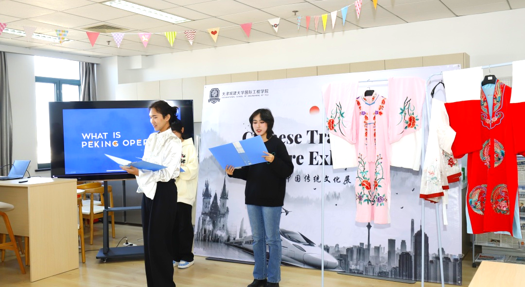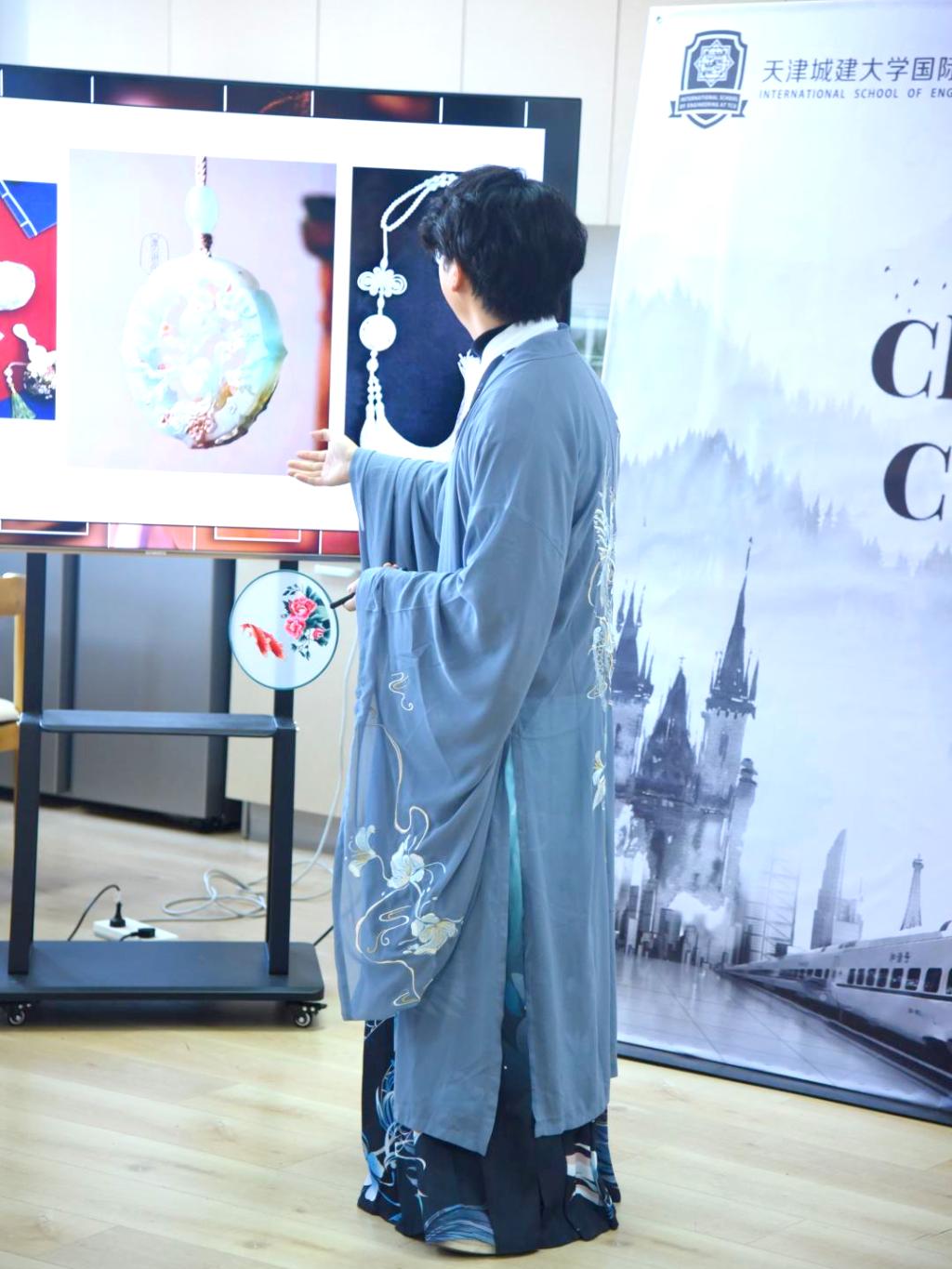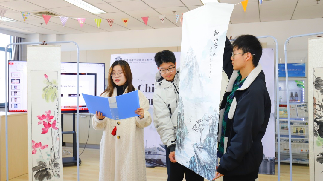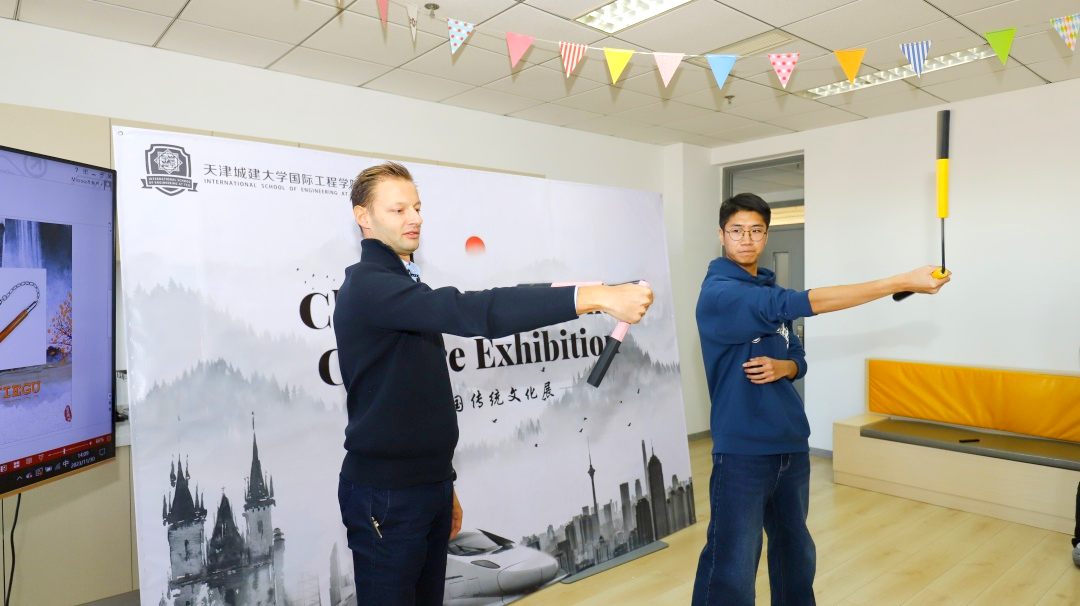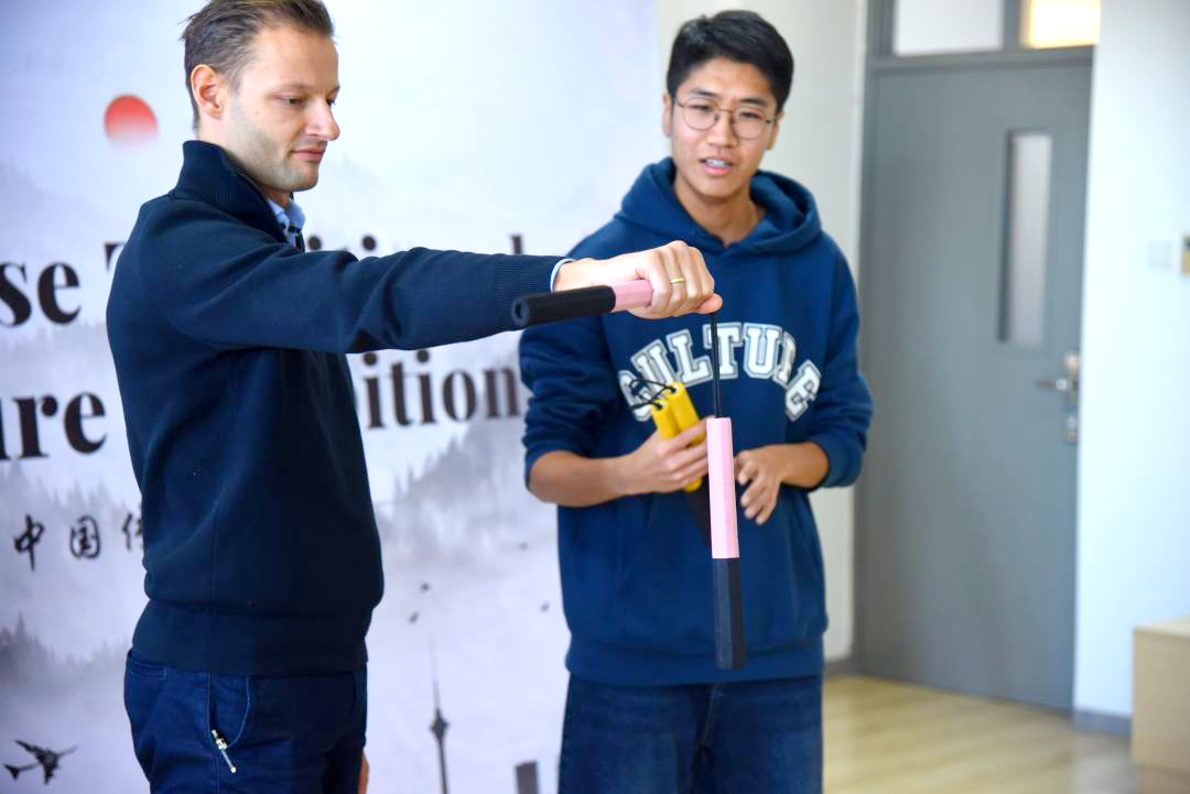 活动中,同学们用中文和英语,形象地为师生讲解戏曲、服饰、国画、曲艺、双截棍、非遗技艺及书法等中华优秀传统文化。通过文化展示与文化体验等方式,全方位、多角度地介绍了中国戏曲、服饰、国画等艺术作品。外籍教师和同学们兴致盎然,积极动手练习,在沉浸式体验中感受中华优秀传统文化的魅力。