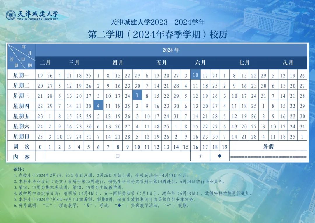 春季学期教学周为2024年2月26日至7月7日,共19周。全校本科生2024年2月26日开始上课,毕业生毕业答辩在第15周进行,其他年级考试周为16-17周,实践教学周为18-19周。