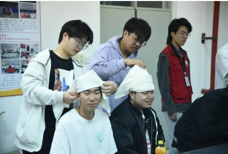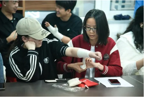 扈队长向同学们展示了绷带及三角巾的几种简单包扎方法。他详细介绍了螺旋式包扎、八字包扎法、包扎头部以及大悬臂挂等技巧,并逐一进行了示范。同学们在扈队长的指导下,纷纷动手实践,学习如何正确地进行包扎。