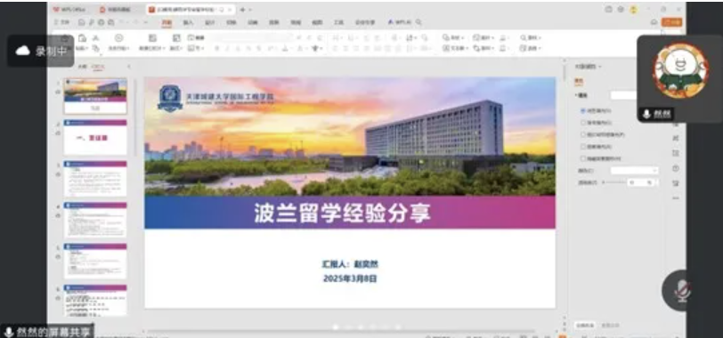 The event featured online presentations by current students studying at Cracow University of Technology (CUT) and Białystok University of Technology (BUT), including Zhao Yiran, Tan Yang, Liang Zhifeng, and Hei Chenxin. These student representatives shared detailed guidelines on visa documentation preparation and practical experience on the life at CUT and BUT. Their contributions reinforced the college’s mentorship model of "passing on experience, helping peers, and guiding newcomers," offering 2023 intake students an immersive preview of Polish education, culture, and life. 2022级建筑学专业赵奕然分享