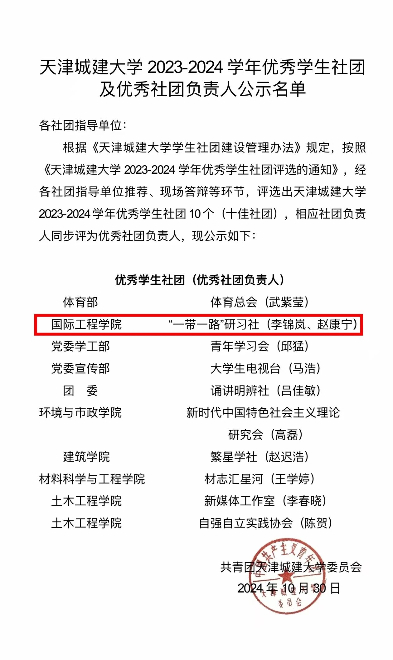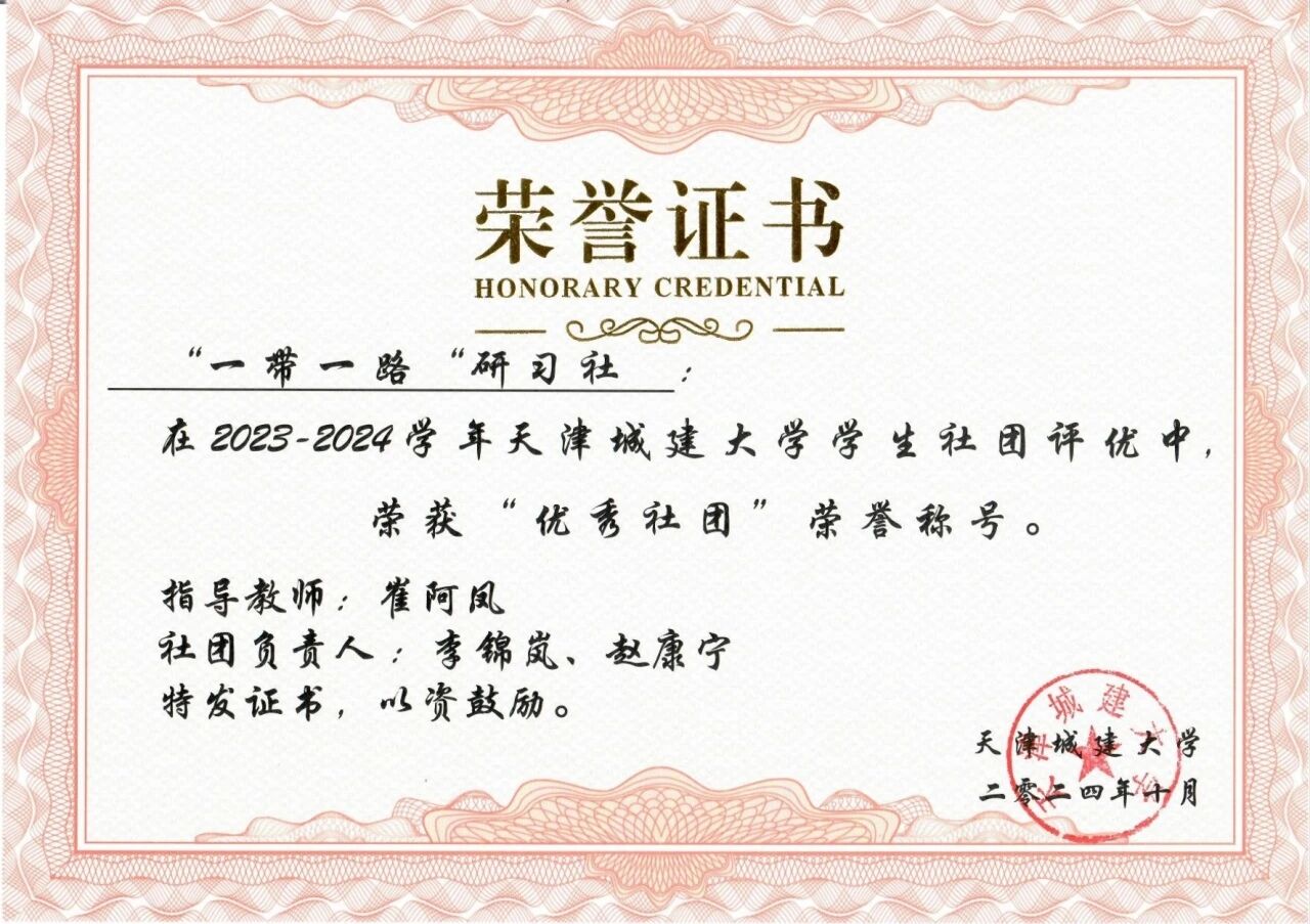 To date, the Belt and Road Research Society has hosted 42 English-language forum lectures, organised 13 events related to science, technology, and cultural creativity competitions, convened 19 science forums, and facilitated 10 Sino-foreign cultural exchange sessions. During the 2022-2023 academic year, the society was honoured with university-level and faculty-level awards for excellence. In the 2023-2024 Tianjin Municipal "Vitality Society" selection, it achieved a place within the top 100.
