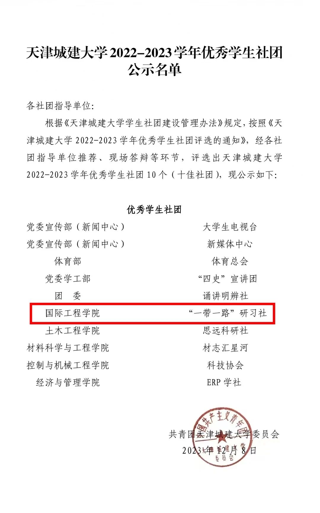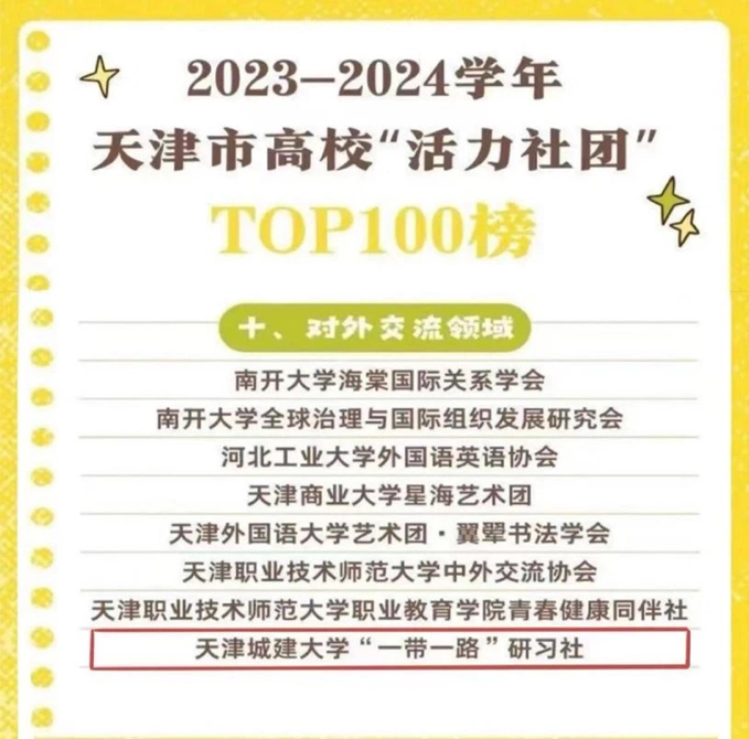 截至目前,“一带一路”研习社共举办了42场英语论坛讲座,涉及科技文化创意类竞赛的活动有13场,举办了19场科技论坛以及10场中外文化建设交流会。在2022-2023学年度,社团荣获了校级和院级两个优秀社团的荣誉,在2023-2024学年天津市“活力社团”评选中荣登前TOP100。