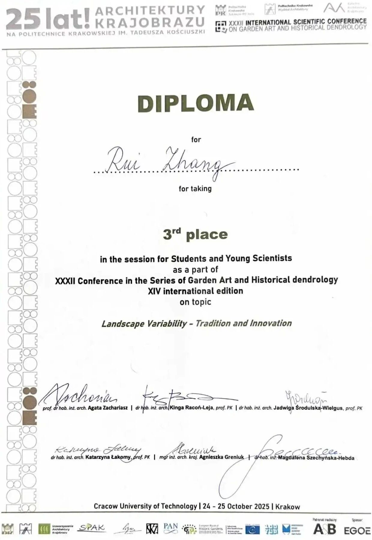 尤其值得骄傲的是,该奖项的前两名获得者均为博士研究生。张锐同学作为硕士研究生取得这一成绩,实属难能可贵。奖项由克拉科夫工业大学风景园林系主任Agata Zachariasz教授领衔的多位资深教授评审团共同评定并颁发,这份沉甸甸的荣誉充分彰显了304永利集团硕士公司产品的卓越质量与国际化学术水平。