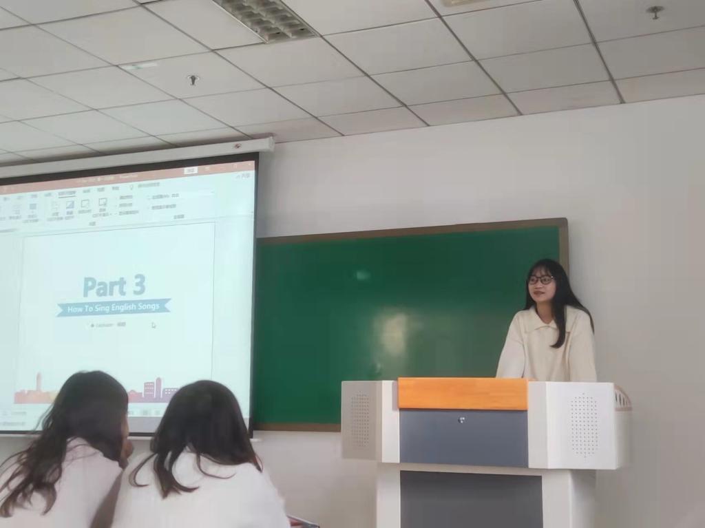 活动最后,英语员工助理杨晴同学以英文歌词为例讲解英文发音要领,让同学们在轻松的氛围中掌握英文朗读技巧。